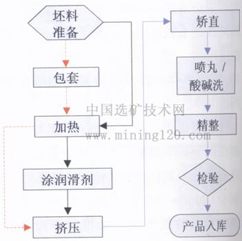 鈦是一種高活性金屬,不僅在空氣中加熱極易污染,而且在一定的溫度、壓力和表面狀態(tài)下具有和模具粘結(jié)的特性。鈦的導(dǎo)熱性差,熱擠壓時坯料表層與中心易產(chǎn)生較大溫差,促使金屬流動不均勻性加劇,這樣表面層就產(chǎn)生較大的附加拉應(yīng)力,在制品表面易形成裂紋。嚴(yán)重時,在擠壓棒材及管材上可能產(chǎn)生大的中心擠壓縮孔。同時,擠壓鈦及鈦合金時熱效應(yīng)顯著,不合適的擠壓工藝對擠壓品組織和性能有副作用。鈦的彈性模量低,回彈嚴(yán)重,成型困難。因此鈦合金擠壓變形過程比鋁合金、銅合金等其它有色金屬擠壓變形過程更為復(fù)雜。鈦材熱擠壓工藝過程根據(jù)坯料是否包套有所區(qū)別,其主要工藝流程如圖2所示。鈦材熱擠壓技術(shù)發(fā)展至今,中外相關(guān)技術(shù)人員圍繞提高鈦擠壓材質(zhì)量和成材率、降低生產(chǎn)成本在坯料制備、坯料加熱溫度、擠壓比、擠壓速度、潤滑及擠壓模具等方面做了大量研究探索工作。