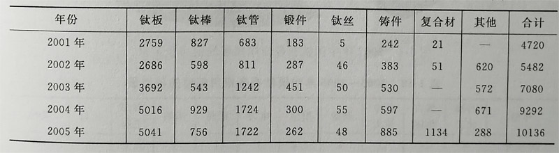 美國與日本的鈦加工材用途比較見表1-16,數(shù)據(jù)來源于上海國際鈦會議(從表1-16中可看出美國2001年鈦加工 材用量為24979t,其中宇航用量為14500t,占58.5%,這說明美國以航空工業(yè)為主。日本2002年鈦加工材用量為 14481t,其中宇航用量為705t,只占4.9%,日本是以民用工業(yè)為主。俄羅斯2000年宇航應用為45%~48%,船舶應 用為7%~12%,石油、化工和其他工業(yè)應用為12%~18%,出口為20%~30%,說明俄羅斯以宇航和船舶工業(yè)為主 出口量也較大近5年來,中國鈦材產(chǎn)量見表117(根據(jù)中國鈦協(xié)會統(tǒng)計),2001年為4720:;2002年為5482t;200年 為7080t;2004年為9292t;2005年為10136t鈦材產(chǎn)量增加近一倍(近10000,日前已成為繼美國、俄羅斯、日本 之后,躋 身世界第四大鈦工業(yè)國。