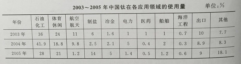 2002年鈦在中國各領域中的使用量,一半以上的鈦用于化工領域,其次為能源和航空航天領域,分別為18%和 13%,與圖1-1中數(shù)據(jù)相比可以發(fā)現(xiàn),北美、西歐鈦的主要使用領域是民用航空,而中國由于民用航空制造業(yè)比較 薄弱,因此在此領域鈦的使用量較少。2003~2005年鈦應用領域用量。