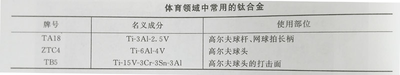 下表列出了體育領域中常用的鈦合金及它們使用的部位和原則。