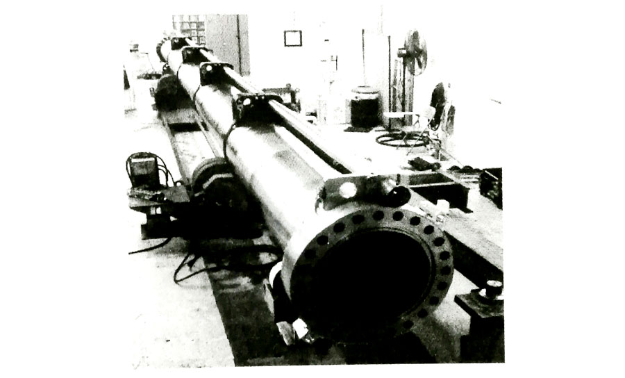 英國北海油田上應用的鈦合金隔水管是用Ti-6Al-4VELI(Grade23) 鈦合金制成的超大型高壓管,由30根Φ599mm(內徑)×25mm(壁厚)X14.6m(長)巨型鈦合金管連接而成, 總長438m, 其產(chǎn)品實物照片見圖2, 該隔水管由美國RMI公司制造。用鈦管代替鋼管,可降低提升力63%,降低制造成本40%,它適用于350m水深油田的采油。