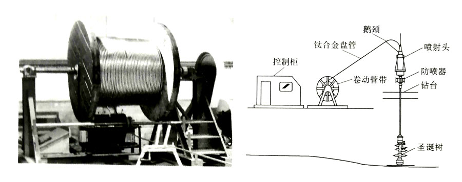井下作業(yè)流送管通常采用Grade2、Grade7、Grade9、Grade12、Grade18、Grade28等六種鈦及鈦合金焊接盤管制造,目前的最大外徑為63.5mm,最小壁厚為3.2mm,盤管長度可達1630~3050m。據(jù)報道,未來盤管的目標外徑希望達到152mm。使用鈦合金盤管代替鋼制盤管后,其盤管的疲勞壽命是鋼制盤管的5~10倍。同時,其在含酸或含硫井中的腐蝕疲勞壽命也得到了較大提高。圖5為鈦合金盤管的產(chǎn)品實物照片及其應用示意圖。