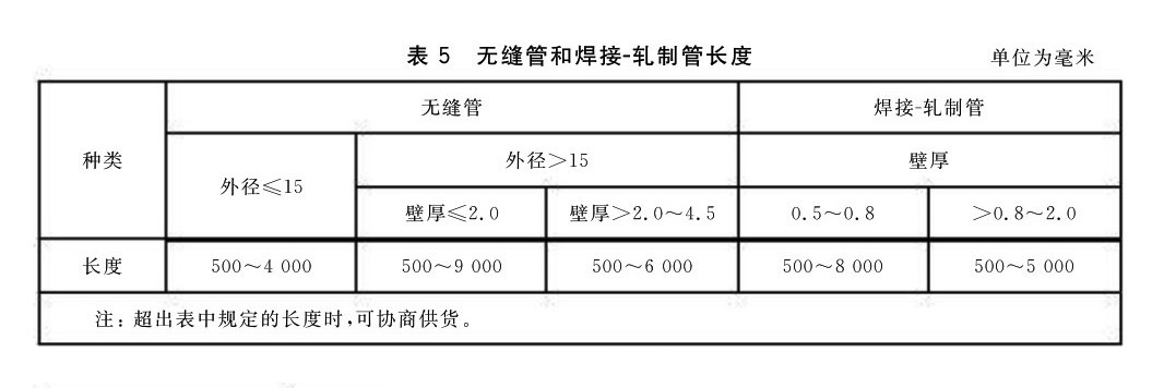 3.2.3 管材的定尺或倍尺長度應在其不定尺長度范圍內,定尺長度<6000mm時.允許偏差為+60mm,定尺長度≥6000mm時,允許偏差為+10mm。倍尺長度還應計人管材的切口最,每一切口量為5mm。