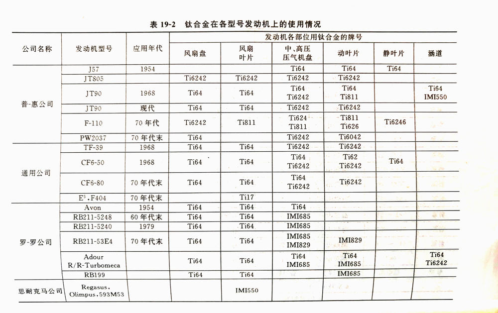發(fā)動機(jī)是飛機(jī)的心臟。發(fā)動機(jī)的風(fēng)扇、高壓壓氣機(jī)盤件和葉片等轉(zhuǎn)動部件,不僅要承受很大的應(yīng)力,而且要有良好的耐熱性,即要求鈦在300~650℃溫度下具有抗高溫強(qiáng)度、抗蠕變性和抗氧化的性能。歐美各型號發(fā)動機(jī)的鈦合金使用情況見下表。