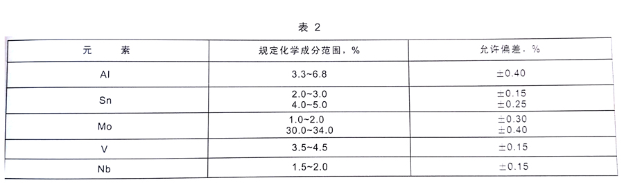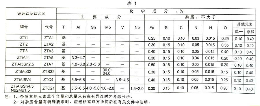 2.1.1 鑄造鈦及鈦合金化學(xué)成分應(yīng)符合表1的規(guī)定。
