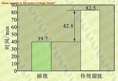 在此參數下層銑,共需切削48層,包括刀具空行程時間共為 82.5min。 如圖9所示,插銑比層銑時間減少了約42.8min,切削效率提高了51.9%。在鈦合金深槽的開槽加工中插銑的切削效率更高。