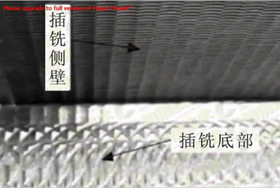 插銑加工后TC4鈦合金槽腔如圖6所示。槽腔表面粗糙,側壁刀痕明顯,每隔6mm形成一個殘留棱,棱高最大值為0.5mm。槽腔底部表面也有明顯的刀痕。與層銑相比,插銑已加工表面粗糙,需進行后續精加工。
