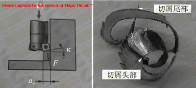插銑加工中銑刀的端面刃為主切削刃,切削過程中銑刀沿其軸向的進給速度vf決定插銑加工的每齒進給量。與普通層銑類似,插銑切屑的大小由銑削寬度、每齒進給量等切削參數及銑刀直徑、主偏角等銑刀幾何參數共同決定(見圖7a)。切屑寬度由銑削寬度和銑刀主偏角決定,切屑厚度由每齒進給量決定,切屑長度由銑削寬度和銑刀直徑決定。插銑的切屑向外螺旋卷曲,切屑頭部較窄,中部變寬,切屑尾部又逐漸變得很窄,單個切屑一般可形成兩個螺旋(見圖7b)。切屑尾部由寬逐漸變窄,表明銑刀在切出過程中承受載荷逐漸降低,刀片切出工件瞬間承受的拉應力也大幅降低。根據切屑形態可知,此時插銑切削狀態有利于降低刀具的磨損,提高刀具使用壽命。