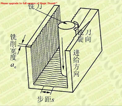 如圖1所示,插銑加工時,銑刀沿軸向從工件上表面向下進給切削,到達底部后完成切削,向上抬起退刀至工件上表面的初始進刀位置,完成一次插銑加工過程。然后,銑刀沿槽腔縱向移動到下一位置,再重復前述的插銑加工過程,完成下一次插銑加工,此時的縱向移動距離為插銑的銑削寬度ae。依此方法,銑刀沿槽腔縱向從頭至尾完成插銑加工后,再沿槽腔橫向移動一個步距S,重復沿槽腔縱向的插銑加工。反復進行上述加工過程,直至完成整個槽腔的插銑加工。