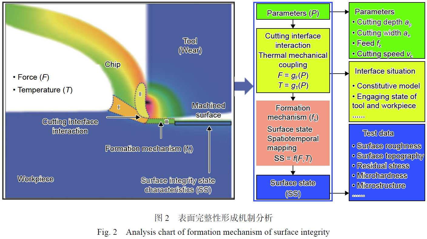 表面完整性形成機制就是描述給定切削工藝因子與切削加工過程中的切削力和溫度,及最終產生的表面完整性狀態(tài)特征之間的關系及其影響機制。如圖2 所示,表面完整性形成過程主要包括兩個階段:第一階段為不同工藝因子下,產生不同的切削力F = gF(P)和切削溫度T = gT(P);第二階段為不同熱力耦合作用下產生不同的表面完整性狀態(tài)特征SS = f(F,T)。在表面完整性形成過程中,切削界面熱力耦合作用不僅受工藝參數(shù)、刀具條件、潤滑方式的影響,還受材料性能、刀具-工件嚙合狀態(tài)、輸出響應信號監(jiān)測等界面復雜工況的影響。切削加工過程中的熱力耦合作用使得材料分別在變形區(qū)Ⅰ、Ⅱ、Ⅲ內產生應力、應變,從而使工件表層及亞表層組織、成分、力學性能發(fā)生變化,未得到釋放的切削力和切削溫度轉變?yōu)樽冃文苁构ぜ砻娈a生大塑性變形,同時伴隨著工件表面不均勻的應力和變形,構成了殘余變形區(qū),殘余變形區(qū)的變形儲存能是加工表面微觀組織、加工硬化、殘余應力形成的能量來源。