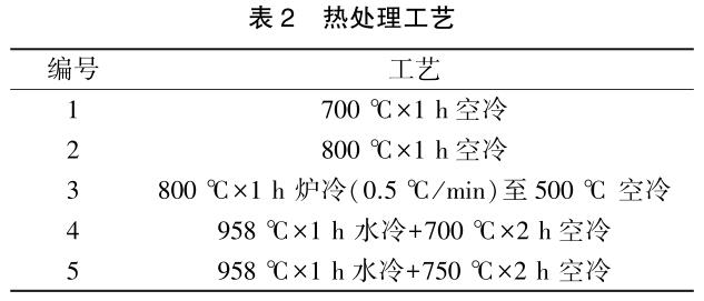 從棒材的1/2半徑處取樣制備夏比U型缺口沖擊試樣,尺寸為58mm×58mm×11mm,按表2工藝進行熱處理。按GB/T 229進行沖擊試驗。按GB/T 5168采用LEICA-DMTRM圖像分析儀對沖擊試樣進行金相檢驗,試樣用10ml氫氟酸+25ml硝酸+65ml水的混合液浸蝕,采用平均值測量法評定初生α相晶粒度。