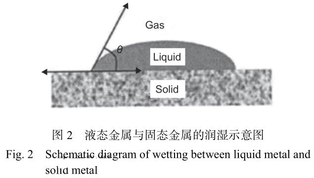 近年來,越來越多的學者對球化現(xiàn)象形成原因進行了大量的研究,但各持不同的意見。其中“液態(tài)金屬與固態(tài)表面的潤濕問題”的說法較為普遍接受[26]。球化根據(jù)尺寸不同可分為大尺寸球化和小尺寸球化,對大尺寸球化的形成原因歸結(jié)于液-固潤濕問題。圖 2 所示為液態(tài)金屬與固態(tài)金屬的潤濕示意圖,當熔融金屬液均勻鋪展時,潤濕角θ <90°,固液金屬潤濕性良好,不會出現(xiàn)球化,當金屬液很難鋪展于固態(tài)表面時,θ > 90°,固液金屬潤濕性差,產(chǎn)生球化反應(yīng)。對于小尺寸球化的成因,則認為是加工過程中發(fā)生液滴飛濺,在熔道或熔道周圍凝固成金屬球,因為金屬液飛濺相對較少,所以金屬球的尺寸也較小。Sallica 等[12]通過研究 SLM成形件 Ti-6Al-4V 的微觀組織,發(fā)現(xiàn)過高的激光功率會減小熔融金屬的表面能,并導致球化現(xiàn)象的產(chǎn)生。張曉博[27]研究了加工環(huán)境對球化現(xiàn)象的影響,認為成形氣氛中的氧元素容易與熔融金屬液發(fā)生反應(yīng),形成一層致密的氧化物薄膜,該薄膜并不利于金屬液與固體基底潤濕、粘合,容易導致球化的產(chǎn)生,且球化現(xiàn)象隨氧含量的增加,效果越明顯;他還研究了工藝參數(shù)對球化現(xiàn)象的影響,認為激光功率過高,會出現(xiàn)“飛濺”,導致熔道間的金屬球大量出現(xiàn),球化現(xiàn)象明顯;掃描速率過快,激光在粉末上停留的時間較短,金屬液溫度低,流動性及潤濕性差導致球化現(xiàn)象明顯。沈以赴等[15]認為球化是由于液相表面張力大、黏度高,或熔融粉末與未熔化的粉末顆粒和基板未發(fā)生浸潤等的影響下產(chǎn)生,進一步分析表明,激光快速成形過程中的氧氣是導致球化的直接原因。Gusarov 等[28]借助 Plateau-Rayleigh 毛細不穩(wěn)定理論[29]指出:球化現(xiàn)象與熔池的幾何形狀密切相關(guān),在二維層面上,熔池長度與寬度的比值大于 2.1 時,容易出現(xiàn)球化現(xiàn)象。