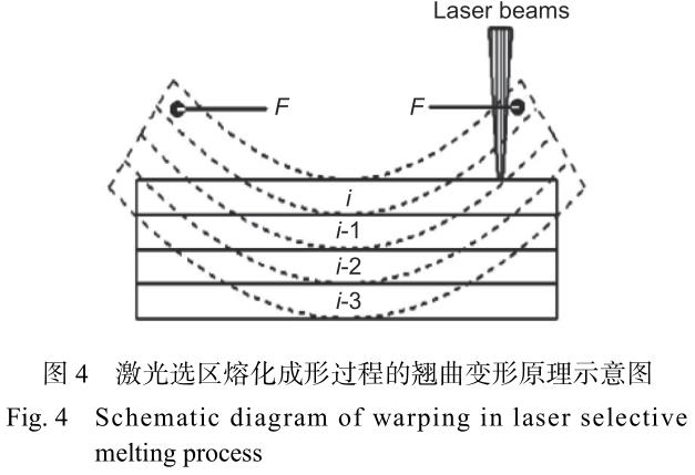 翹曲變形對成形件的尺寸大小、成形精度、形位誤差等的影響很大,甚至會嚴重影響后續(xù)加工。國內(nèi)外針對鈦合金翹曲變形的研究較少。吳偉輝等[40]對成形過程中造成翹曲變形的成因進行了研究,翹曲變形示意圖如圖 4 所示,可以看出激光作用的當前層 (i) 層,受到高溫的作用處于塑性狀態(tài),在凝固過程中過快的冷卻速率,導致收縮變形;第 (i–1) 層溫度略低于第 i 層的溫度,此時塑性較差或處于彈性狀態(tài),在冷卻過程中,其收縮變形小于第 (i) 層的變形量,但是在第 (i) 層嚴重翹曲變形的作用下,第 (i–1) 層也會發(fā)生大幅度的向上翹曲變形。同理第 (i–2)、(i–3) 層也有相同的影響,只是距離 (i) 層越遠,對應(yīng)層的收縮量越小,當距離 (i)層到達一定距離時,對應(yīng)的層已不發(fā)生收縮變形,翹曲變形終止。齊海波等[41]采用電子束選區(qū)熔化成形TC4 鈦合金成形件,認為掃描路徑對成形件溫度分布的影響,導致熱應(yīng)力分布不均勻是翹曲變形產(chǎn)生的主要原因。楊立寧等[42]通過建立數(shù)值分析模型,研究了在不同掃描路徑和堆積速率下,所對應(yīng)的熱應(yīng)力場分布和變化行為,以及它們對制件翹曲變形的影響。李守衛(wèi)等[43]分析了 SLS 技術(shù)成形過程中的溫度場與熱應(yīng)力場對翹曲變形的影響機理。