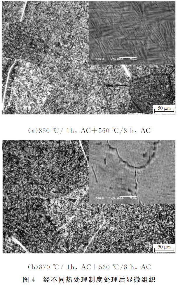 選擇棒材R/2部進行熱處理試驗,圖4為合金經不同熱處理制度處理后顯微組織,由圖4可見,合金經兩種不同熱處理制度處理后,其顯微組織形態均以粗大的β晶粒為主,β晶粒內部析出大量彌散分布的細小α相。因為TB15鈦合金的中β穩定元素含量較高,約為15.4%,通過計算,其Mo當量達到13.95,這就導致該合金在普通的空冷條件下,就可讓組織中的高溫β相保留,最終形成過飽和固溶體。兩種工藝對比來說,圖4b中β晶粒度較圖4a相比,其晶粒尺寸較大,這是因為圖4b的組織經歷的固溶溫度更高,較高的溫度會導致晶粒長大更明顯[12]。