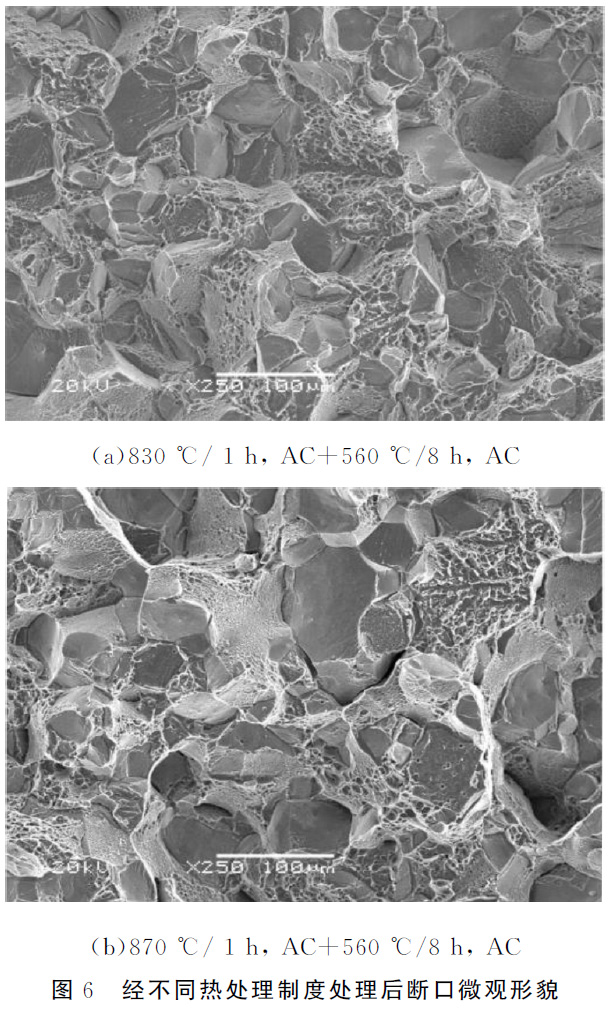 圖6為合金經不同熱處理制度處理后斷口微觀形貌,由圖6可知,兩種熱處理制度下合金的斷口微觀形貌總體相似,均以巖石狀形貌為主,同時存在大量細小等軸狀韌窩分布在其表面,并可見明顯的撕裂棱,存在β晶界。這是由于經兩種制度的熱處理后,組織均以包含粗大β晶粒,試樣在拉伸過程中,由于粗大β晶粒本身的具有較差協調性,在拉伸過程中易產生脆性斷裂,故形成巖石狀形貌。因為拉 伸時,組織中產生的裂紋并非在α相中形成,而是出現在發生塑性變形的β晶粒中,在拉伸不斷進行的過程中,其組織中會產生大量微孔,在微孔不斷長大以及增加的過程中,微孔會接觸相連,最終形成細小的韌窩分布在斷口表面[17]。由于斷口形貌中韌窩的數量以及尺寸能體現出合金塑性的大小,雖然圖6的形貌以巖石狀為主,但由于存在大量細小的韌窩,表明合金具有一定的塑性,這與合金的拉伸性能相符合。