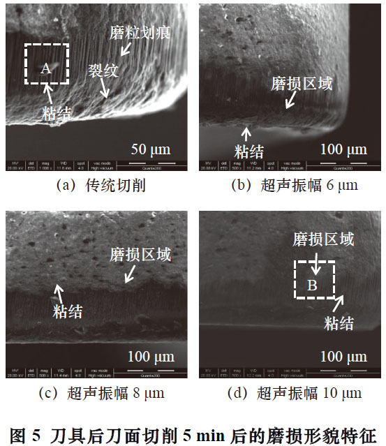 傳統(tǒng)切削和超聲切削的后刀具磨損SEM 如圖5所示。通常采用后刀面的磨損量作為評(píng)判刀具的磨損壽命,并在刀具磨損形貌分析中,首先觀察刀具的后刀面磨損特征。由圖5a 可知,刀具涂層脫落嚴(yán)重,說明了傳統(tǒng)切削刀具表面磨損相對(duì)劇烈,后刀面分布著顯著的溝槽特征,屬于典型的磨粒磨損特征。而刀具磨損程度取決于刀具材料的硬度及耐磨性,出現(xiàn)磨粒磨損的的原因主要是切削過程中的材料脫落參與了刀具與試樣接觸界面的高溫磨損,形成高硬度的化合物并在切削中充當(dāng)磨粒,刀具與試樣切削時(shí)在刀具表面不斷摩擦,導(dǎo)致刀具后刀面發(fā)生磨粒磨損并形成表面裂紋[12]。由圖5b~c 可知,超聲切削刀具磨損表面未觀察到明顯的磨粒劃痕溝槽,但存在不同程度的刀具涂層脫落,同時(shí)伴隨著輕微的材料粘結(jié)現(xiàn)象。值得注意的是超聲振幅為10 μm 時(shí)(圖5d),刀具后刀面磨損較輕,表面涂層未出現(xiàn)大面積脫落。