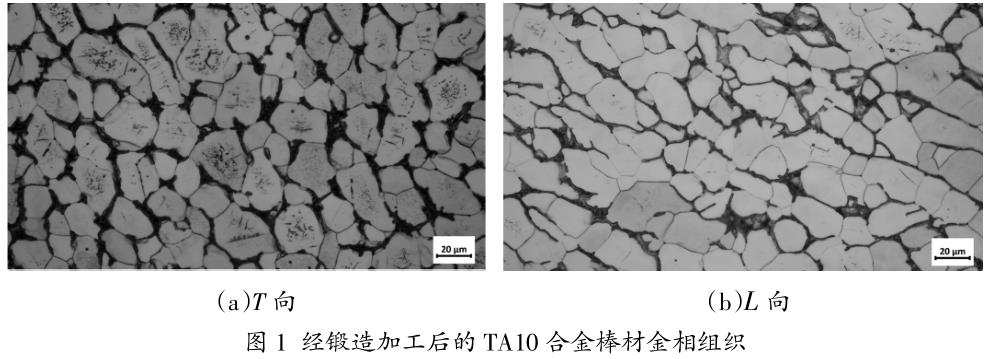 經(jīng)鍛造加工后的TA10合金棒材金相組織如圖1所示。由圖1可知,棒材的組織為典型的等軸組織,金相組織主 要由初生α相組成,初生α相形貌以等軸狀為主,同時(shí)組織中還包含β轉(zhuǎn)變組織,其位于初生α相之間,β 轉(zhuǎn)變組織包含次生α相及殘余β相。由圖1還可知,棒材的T向與L向金相略有差異,其中T向相比于L向的組 織中,其初生α相等軸化程度更高,均勻性更好,而L向的組織中,其初生α相形貌等軸化較差,有部分較 為粗大的初生α相。