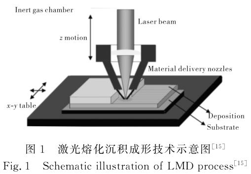 激光熔化沉積成形技術于20世紀90年代由美國Sandia國家實驗室和美國Optomec公司合作開發。隨后,全世界高校和科研機構相繼開展獨立的研究工作,例如美國Sandia實 驗室的激光凈近成形技術(LENS)[3]、中國西北工業大學的激光立體成形技術(LSF)[12]、英國曼徹斯特理工學院的激光直接沉積技術(DLD)[13]、美國密西根大學和POM公司的金屬直接沉積技術(DMD)[14]等。雖然名稱不同,但是基本原理均是利用惰性氣體輸送金屬粉末,再通過送粉器和粉末噴嘴將金屬粉末聚集于千瓦級激光束焦點處進行瞬時熔化,然后按照計算機模型自下而上地逐層堆積金屬熔融層,最終直接打印出三維金屬成形件,整個制備過程均處于惰性氣體保護之中,工作原理示意圖如圖1所示[15]。
