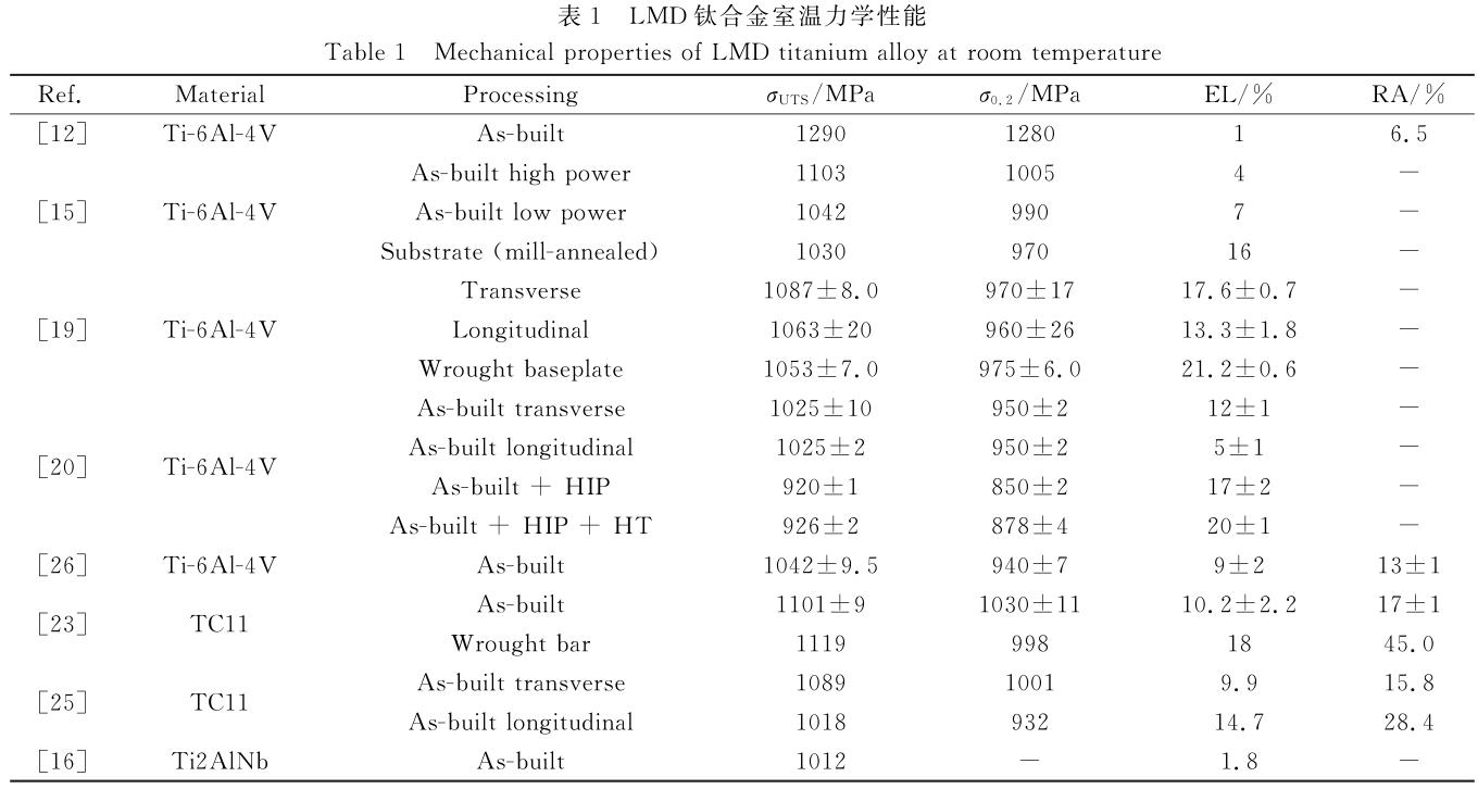 LMD主要參數包括激光功率、掃描速度、搭接率、單層厚度、送粉速率等,為了便于試驗分析,引入線能量并將其定義為激光功率與掃描速度的比值,單位為J/mm。LMD以千瓦級激光器為能量源,熔池溫度高,易形成粗大的晶粒,在制備Ti-22Al-25Nb過程中,顯微組織表現為細針狀魏氏體組織[16,17]。張霜銀等[18]研究表明線能量大于993J/mm時,晶粒呈現等軸晶形態;搭接率為40%時,成形件未見熔合不良現象;單層厚度過小會造成重熔加深,導致層間組織粗大。LMD鈦合金組織具有外延生長的特性,易形成貫穿多個沉積層的柱狀晶粒,顯示出定向凝固特征。Carroll等[19]制備的“十”字型Ti-6Al-4V合金成形件,初生β相沿豎直方向生長為細長的柱狀晶粒,成形件具有力學各向異性,其中橫向伸長率明顯高于縱向伸長率。Qiu等[20,21]研究表明高激光功率和低送粉率能夠最大程度地減少Ti-6Al-4V合金的孔隙率,通過后續熱等靜壓處理能夠促使馬氏體α′相轉變為片層狀α+β相,進而提高合金韌性、消除力學性能的各向異性。TC11鈦合金成形件沿垂直于激光抬升方向具有高強度和低塑性的力學性能;近β相鈦合金Ti-5Al-5Mo-5V-1Cr-1F的晶粒擁有3種形態,分別為沉積層重疊區的大柱狀、頂部的小柱狀和底部的等軸狀[22-25]。表1列出不同牌號鈦合金LMD成形件的力學性能。
