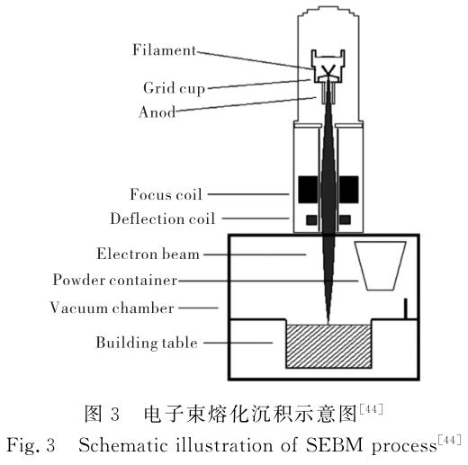 電子束選區熔化成形技術由瑞典ChalmersUniversityofTechnology與Arcam公司在20世紀90年代初期共同開發,采用逐層鋪粉熔化的方式制備金屬零件,工藝流程與SLM 類似,區別在于SEBM以電子束替代激光作為能量源,制備過程處于10-3Pa以上的高真空環境。電子束能量源具有能量利用率高、作用深度大、金屬反射小、材料吸收率高等優點, 成形效率明顯高于SLM工藝;高真空環境能夠最大程度地降低空氣中O、N等間隙元素對材料的污染。