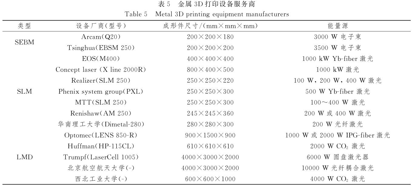 但是,SLM成形效率低、金屬粉末成本高昂是該工藝亟待解決的技術難點。SEBM設備能力介于LMD與SLM兩者之間,既有較好的表面質量,又有較高的成形效率,是目前醫療領域、航空領域的主要制備技術,如圖5所示。表5列出了不同3D打印設備的成形件尺寸和能量源功率,可以看到,SLM和SEBM的設備能量源功率和成形件尺寸均小于LMD設備,因此,LMD具備打印大型成形件的能力。圖6為近年來金屬粉末3D打印設備研發進展情況,可以看到高功率能量源的研發不再是設備的主要關注點,反而大尺寸成形件、高精度光斑、恒定能量源是未來3D打印設備的主要發展趨勢。