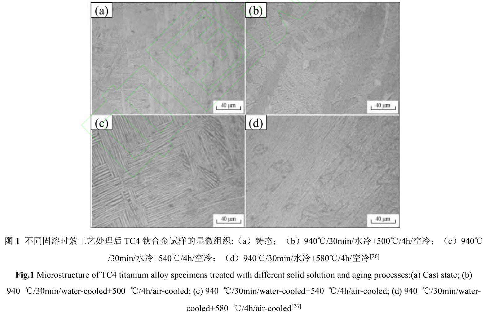 徐堅等人[26]的研究聚焦于不同固溶時效工藝條件下TC4鈦合金顯微組織的演變規律。其研究結果顯示,固溶時效處理顯著促進了針狀馬氏體α’相與亞穩態β相的分解,轉化為更為穩定且彌散分布的α+β相組合。這一變化通過圖1得到了直觀的展示:鑄態TC4鈦合金的組織結構以均勻致密的α相、β相及晶界α相為特征;而經過固溶時效處理后,其顯微組織轉變為以片狀α相、細條狀α相與β相為主的復雜結構,呈現出明顯的組織重構現象。進一步分析發現,時效溫度對TC4鈦合金的組織形態具有顯著影響。在500℃時效條件下,組織主要由細條狀的α相與相間分布的β相構成;隨著時效溫度提升至540℃,細條狀α相逐漸減少,轉變為片狀形態;當溫度繼續升高至580℃時,組織則呈現出片狀α相、細條狀α相與β相共存的復雜結構。值得注意的是,隨著時效溫度的上升,β相的分布逐漸變得不均勻,且其含量也有所增加,這一現象揭示了時效溫度對TC4鈦合金微觀組織結構的深刻影響。
