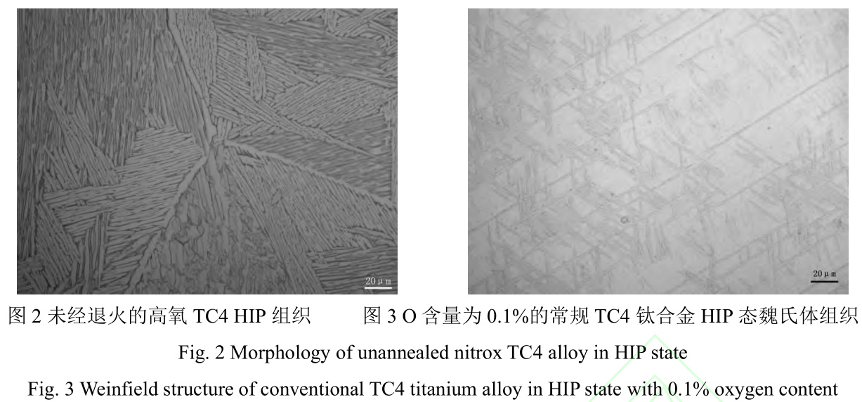 未經退火的高氧{氧含量具體為多少?}TC4鈦合金(對照組)HIP態組織形貌見圖2,圖3是O含量為0.1%的常規TC4鈦合金HIP態魏氏體組織。對比圖2和圖3可以看出,隨O含量增加,α相與α+β相的晶粒尺寸得到了一定程度細化,從最初的2mm,細化到153μm;并且板條狀的兩相組織變細,長寬比明顯降低,魏氏組織中α集束的寬度相較于常規TC4鈦合金組織變窄,長度也有明顯減少。這是因為O元素作為α相穩定元素,能夠擴大α相區,提高α相穩定性,導致α+β/β轉變溫度上升,使合金中α相增多。此外,在熱等靜壓過程中的微觀應力作用下,板條狀的兩相組織發生相對變形,造成α相集束取向發生變化,寬度變窄。