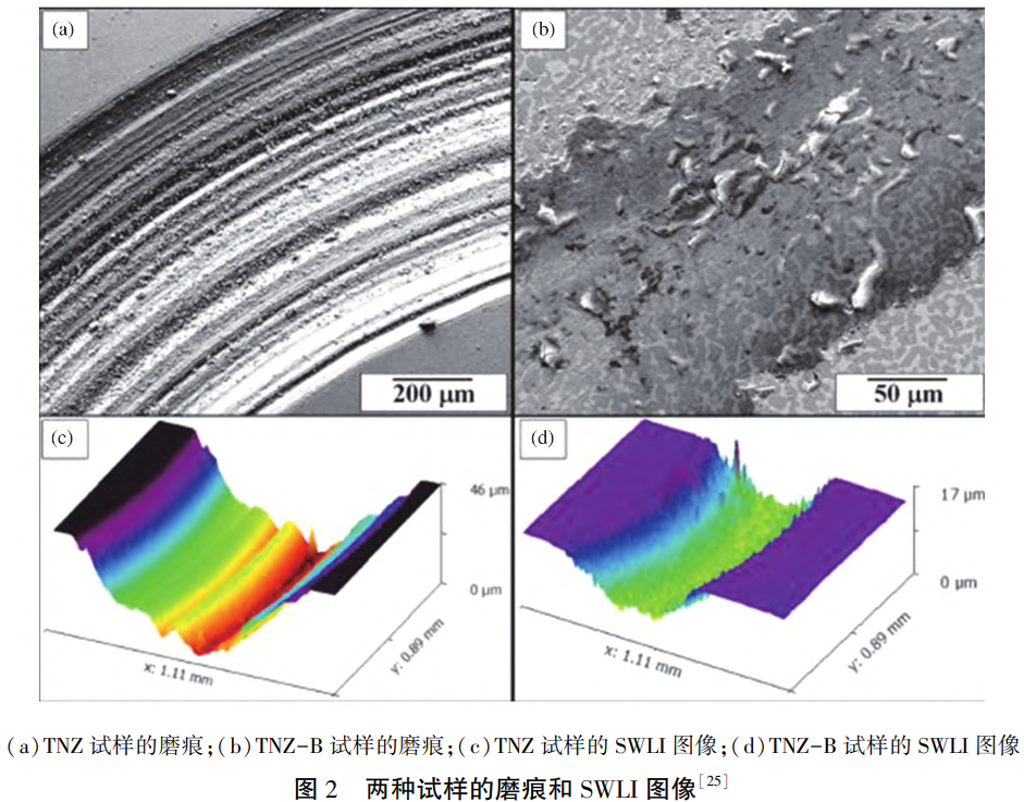 圖2(a)(b)為兩種試樣的磨痕,圖2(c)(d)為三維掃描白光干涉儀(3Dscanni ngwhitelightinterferometer,SWLI)圖像。由圖可以看出,在添加 硼以后,磨損深度明顯減小,磨損面也變得更加平整,表明硼的加入顯著提高了耐磨性。