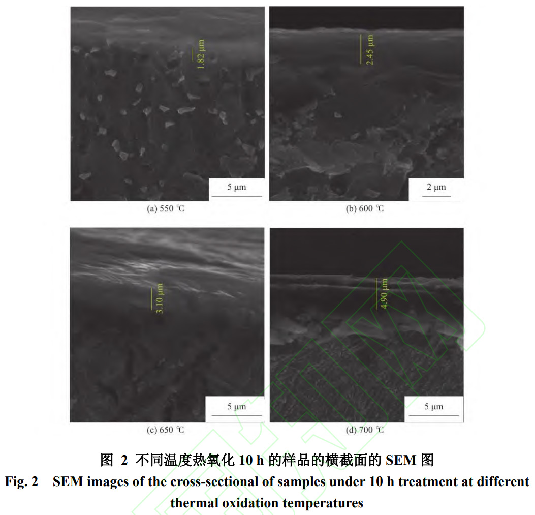 圖1為不同溫度熱氧化10h的樣品表面的SEM圖。從圖1中可以發現,550℃時只有少許氧化顆粒覆蓋在樣品表面,600℃時有較多的薄而小的氧化鱗片,當溫度達到650℃時,氧化顆粒完全覆蓋在樣品表面且比較致密。在700℃時,樣品中由于氧化物的團聚,氧化顆粒較650℃時的有明顯的增大,晶粒之間的間隙變大。樣品表面氧化層開始變得疏松多孔。可以發現,隨著熱氧化溫度的升高,氧化物顆粒逐漸向外生長并且逐漸覆蓋整個表面。而當溫度繼續升高,氧化物顆粒繼續長大,由于氧化物顆粒的生長方向的不一致,從而導致樣品表面微觀形貌中空隙的出現。從圖1(d)中可以看出,氧化膜之間的襯度相差較大,呈現出凹凸不平的狀態。由圖2可知,550、600、650、700℃時氧化層的厚度分別為1.82、2.45、3.1、4.9μm。在較低溫度下,形成的氧化層較薄且增長速度緩慢。總體來看,氧化層的厚度隨著熱氧化溫度的升高而增加。